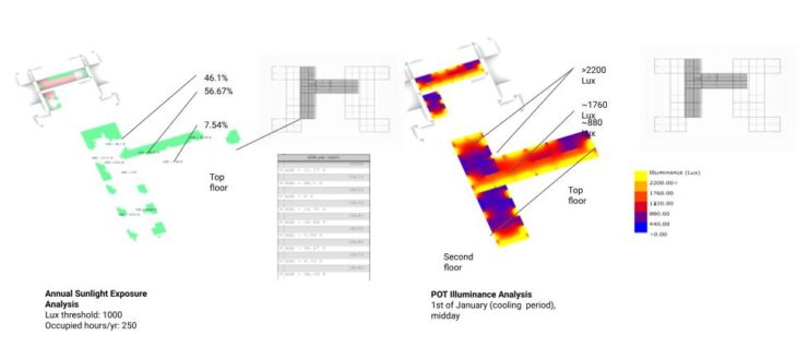 ASE measures the percentage of floor area where sunlight exceeds 1000lux for more than ~250 occupied hours. This study identifies glare – more than 10% ASE would result in visual discomfort.