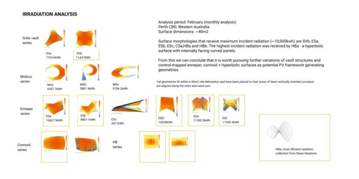 We worked towards incorporating environmental analysis tools into our computational design workflows. This study considered integrating PV cells into a building shell design, investigating the potential of curved forms to capture solar irradiation – the analysis period was set to the month of the year with the highest direct radiation. Moving through a survey of surfaces from vaults generated in kangaroo to remapped surfaces, we found that a hyperbolic surface is the most efficient in terms of energy capture.