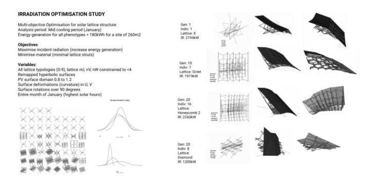 Following from the previous, a related multi-objective optimisation study considered the design of a micro-solar system with the dual objectives of maximising irradiation and minimising construction material. The study worked with remapped hyperbolic surfaces with randomised vertical UV shifts and axial rotation – with the analysis period set to the month with the highest direct radiation and lowest cloud cover. We can see from the study that having more than one planar panel at varying alignments, facilitated by a base curved surface, can help to maximise the capture of solar energy in constrained spaces.