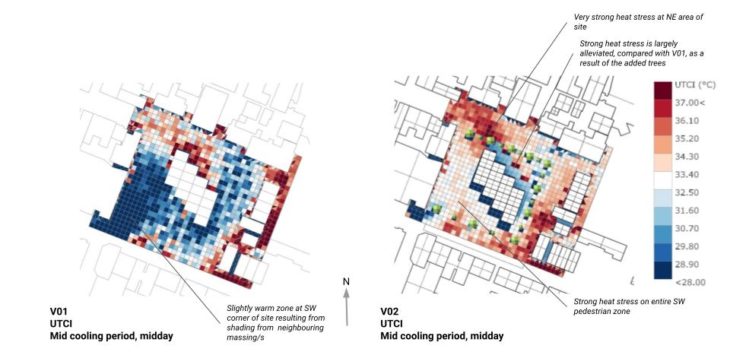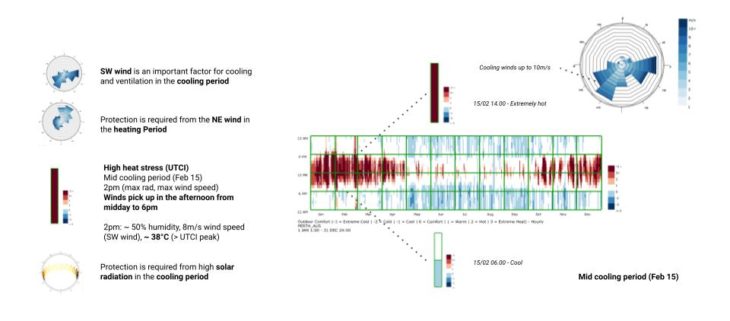 In the middle of the cooling period we note the air temperature is over 10°C in excess of the UTCI peak, however wind speeds coming from the south west also pick up during this time, so allowing for adequate ventilation on site is important. We also note that radiation is intense during this same period, thus shading and adequate ventilation are vital in order to alleviate or avoid heat stress on building inhabitants or pedestrians.