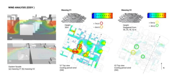 In this study, we found that by changing massing options, we were able to alleviate moderate gales at the building perimeter, and our design decisions also brought about a significant improvement in terms of pedestrian comfort. The corner effect and wind corridor were also completely alleviated.