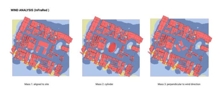 By changing the massing shape and applying the results of these analyses, we were able to adapt the design by taking the surrounding environment into consideration.