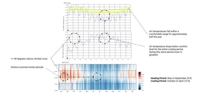 Environmentally Informed Design – Perth CBD is a collection of analyses and design responses created during the Digital Tools for Environmental Analysis program as part of the Master in Advanced Computation for Architecture and Design 2021-2022. Environmental analysis was used to inform and direct design decisions such that structures were iteratively adapted to the climatic conditions of our site.