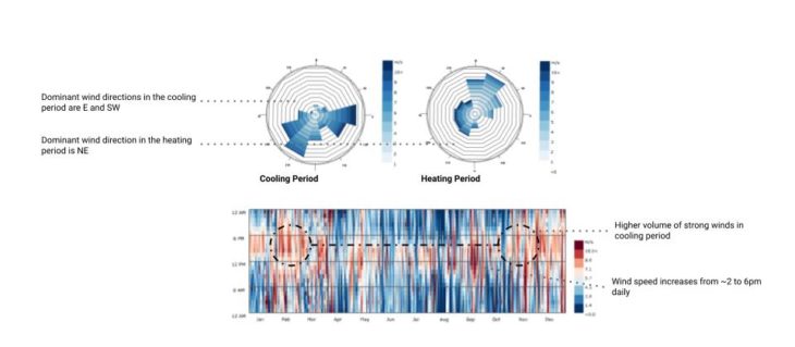 The most important prevailing wind in the cooling period is the south westerly, which reaches speeds of up to 10m/s and can provide much needed cooling in a period of intense heat stress. Winds in the cooling period are typically stronger than during the heating period, picking up from midday to 6pm. The dominant wind in the heating period is the north easterly, reaching slightly lower speeds than the cooling period.