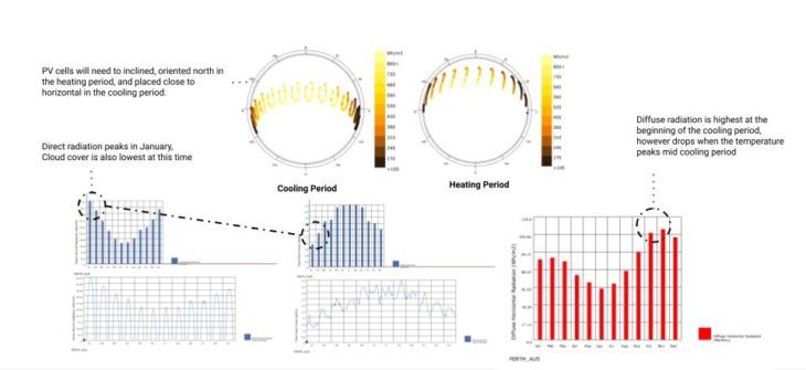 Based on Perth’s latitude, to maximise energy production an optimal inclination of PV cells would be 30 degrees north, give or take 10 degrees. However, we note that in the cooling period, such an inclination would not be ideal, given that the sun passes close to the zenith.