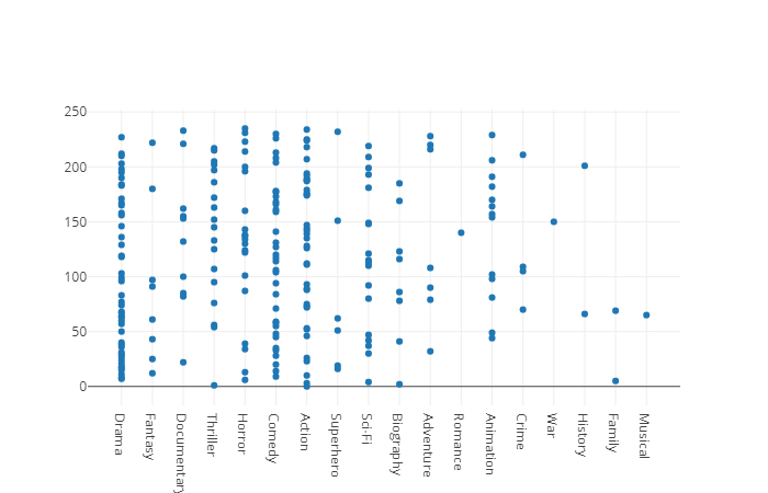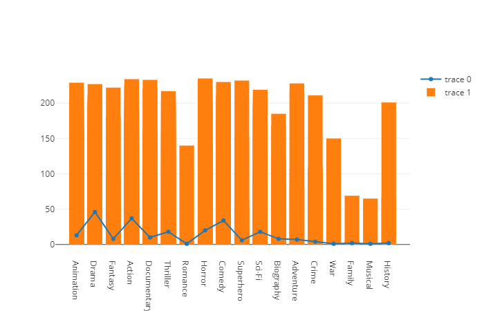 The bar chart (trace 1), illustrates the relationship between genre and duration as above, while the scatter line graph shows the amount of movies to genre (trace 0) as in the first chart.