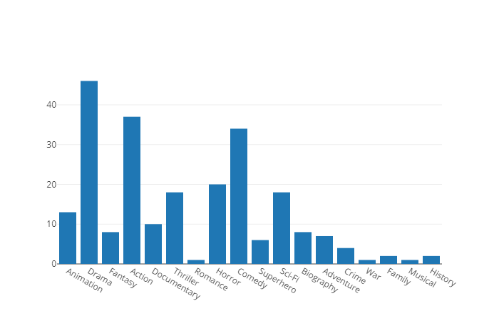 This chart shows Drama as the most produced genre with about 46 movies out of the 236 top movies scraped.