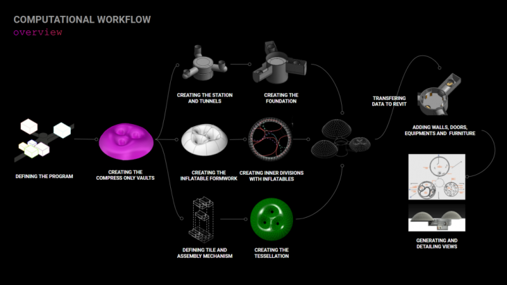 Our computational workflow started from defining the program, and then for each of the three parts we designed a vault. From that point we followed three separate directions. One designing the station and its foundation, the second designing the inflatable formwork and the inner inflatable divisions, and the third and more difficult one, defining the tiles and defining the tessellation of the regolith panels we would use for the vaults. Putting it all together, we got our whole 3D model, which we took to Revit to add walls, doors and others, and extract the detailed views and documentation.