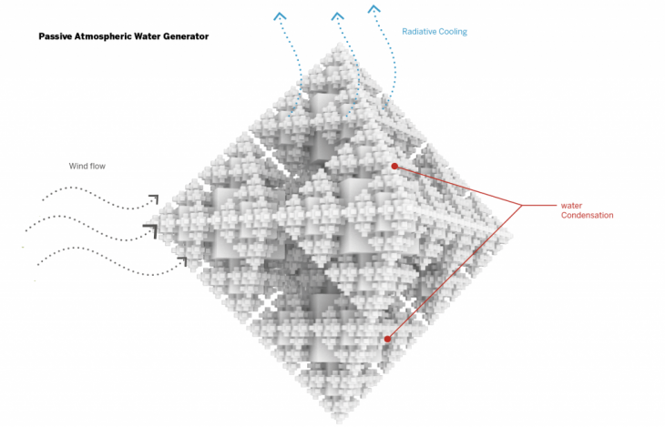 Dried up lakes, melting glaciers and overpopulation have put drinking water systems under stress. Over 3.8 billion people lacking access to fresh water worldwide. As water is becoming a scarce commodity, many cities have shut down most water features. Passive atmospheric water generators are becoming ubiquitous and designers are using recursive algorithms to maximise the surface area while maintaining a compact form.