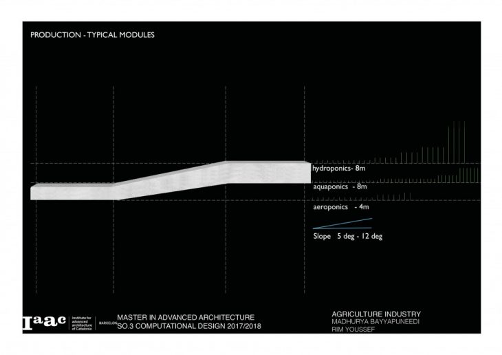In relation to the Urban studio, Modules for food  production for the   site chosen, in Hong Kong are derived  to make the urban farming modular. Each module , has three types of production , Hydroponics, Aquaponics and aeroponics., arranged in a way ,  while taking services into consideration .Each module is designed  to accommodate the various crops it can grow, the  maximum height of the crops, and slope required for  arrangement of strays is taken into consideration .