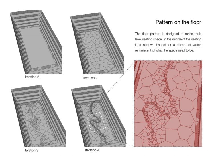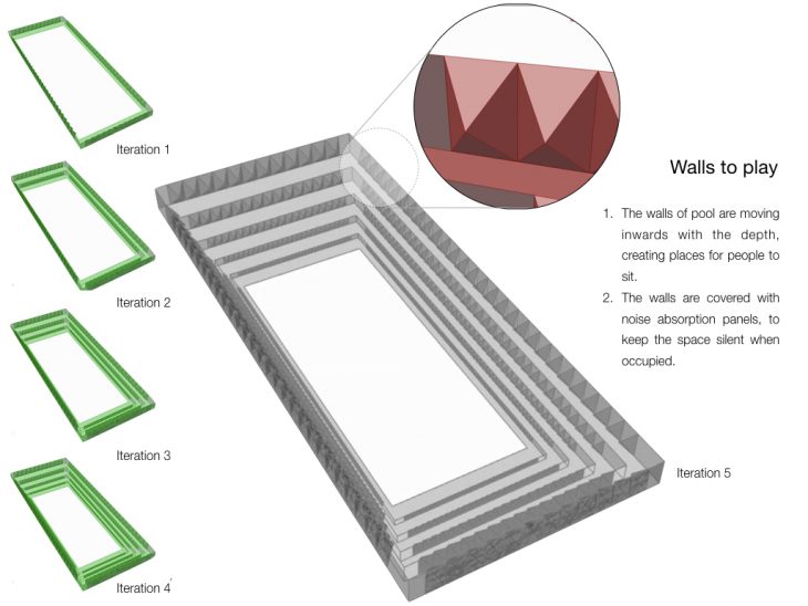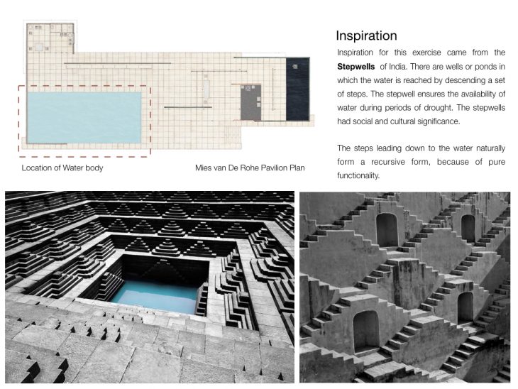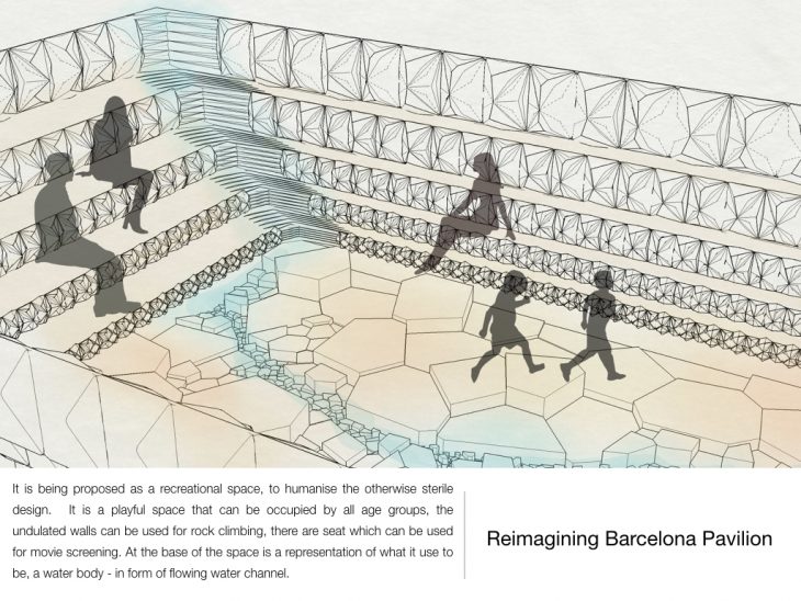 The pavilion for the International Exhibition was supposed to represent the new Weimar Germany: democratic, culturally progressive, prospering, and thoroughly pacifist; a self-portrait through architecture. Taking this conversation forward, and reimagining the spaces as a new age place for cultural exchange, this exercise explores alternative use for the water body at the pavilion.