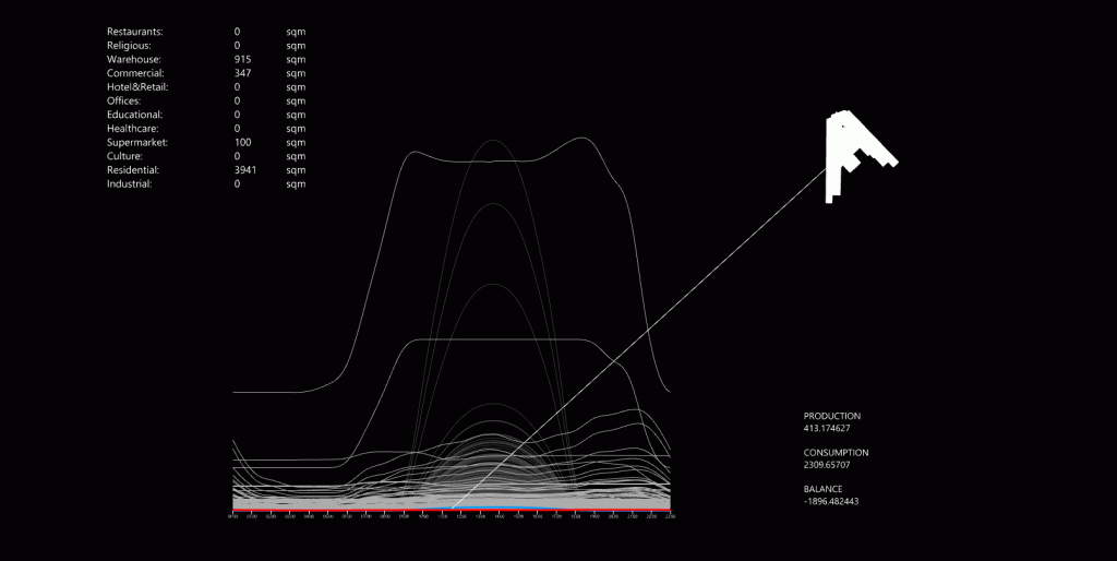 The Sankey diagram has been used to better represent a flow of energy. It shows from left the time of the day, in the middle column the proportion of land uses on Poblenou and on the right one the percentage of that consumption that is supplied by non-renewable resources and renewables. This Graph helped us to link the different layers of information that we already had, understanding how they relate to each other. It is visible how the consumption is higher at night, how residential, industrial and offices are the main consumers and what percentage of that energy can be obtained from renewable sources (Figure 8).