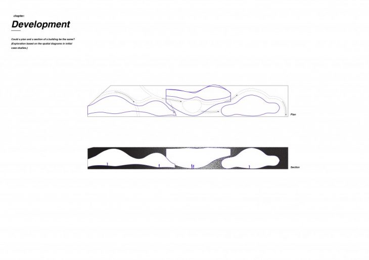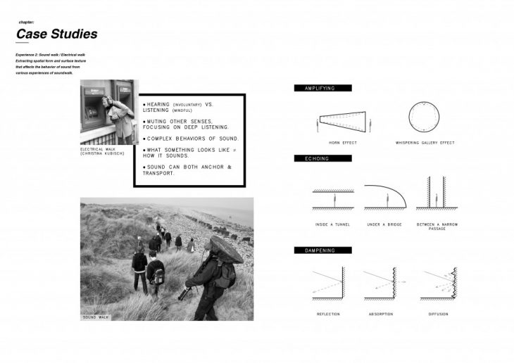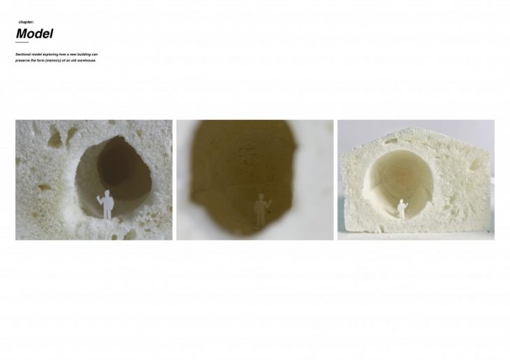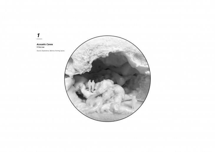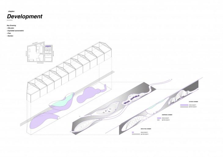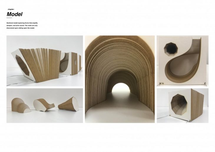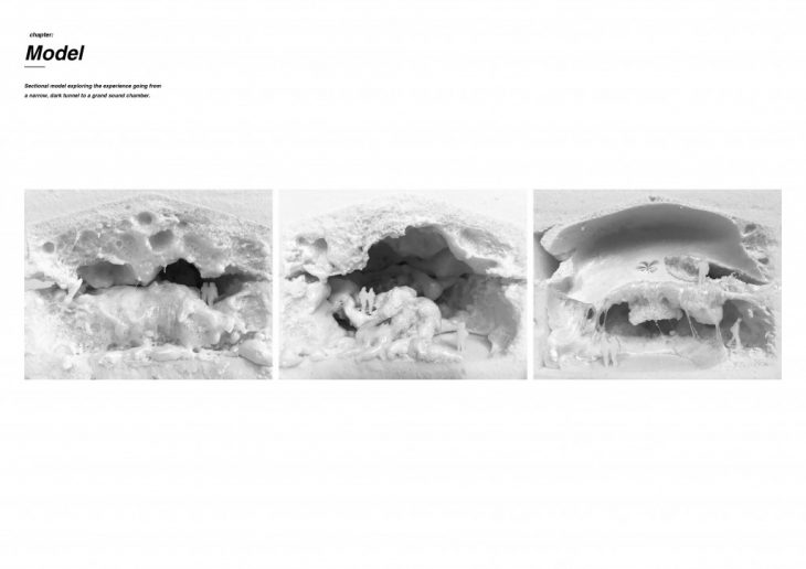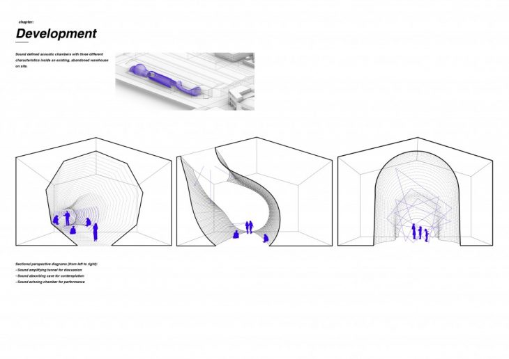 “Acoustic Caves” rethinks about how spaces can be formed with sound, experience, and memory. Sight is the dominating sense for most of us. Often times, we form a first impression based on appearance. When we mute our sight, there is a big space for imagination, and allows us to focus on conscious listening. Through three acoustic chambers that performs in different ways, and takes the form of an existing warehouse, an inclusive educational space is emerged on the site. The first chamber amplifies sound, with the room’s resonant frequencies dominating human voices. The second chamber dampens sound, with water running above the space which allows for contemplation. The third chamber echoes sound, with musicians performing around the audiences.
