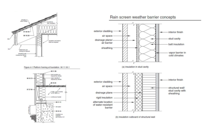 The complexity of the standards found in wood home construction are limited to only 3 categories. From left we have Structural Insulated Panels [SIP], in center multistory platform framing, and on the right glulam timber framing.