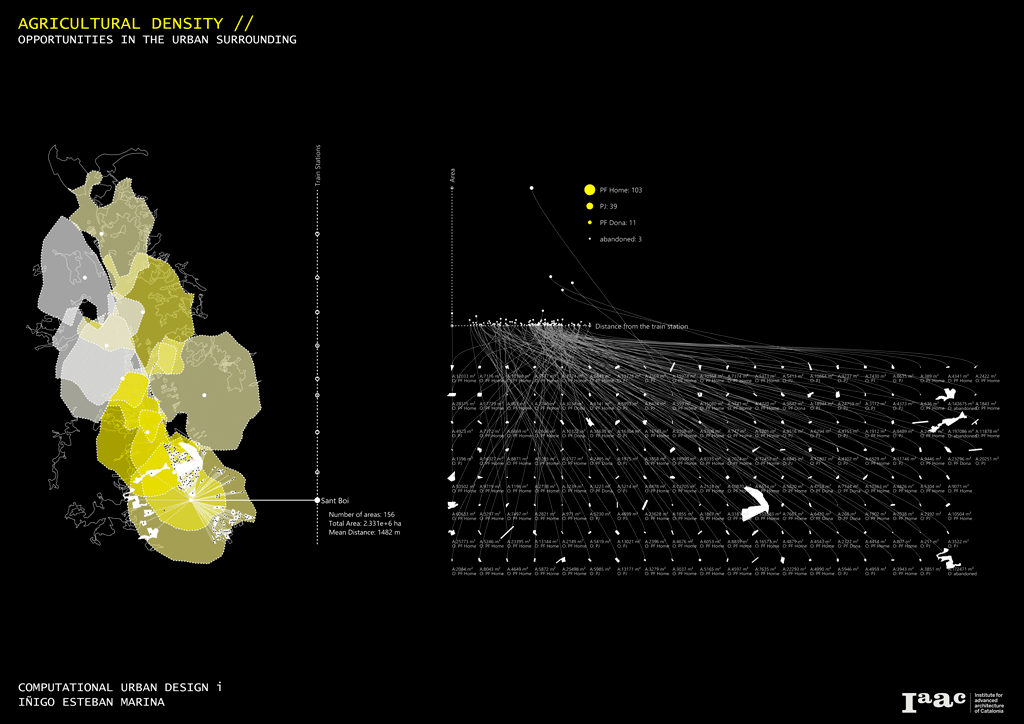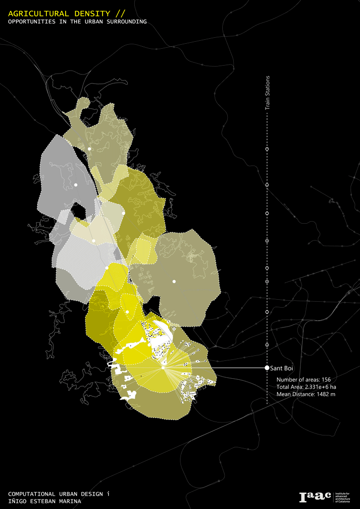 This project is a continuation of a large scale analysis carried out for the Internet of Cities project, which look for the creation of a big sustainable organism in the urban surrounding through a sustainable agriculture. The objective was to understand the relation between the agricultural lands and the isochrones of 30 minutes by walk from the main train stops in the Metropolitan Area of Barcelona. The proximity it´s a key parameter in our proposal, because we need to connect the urban environment with the rural one.