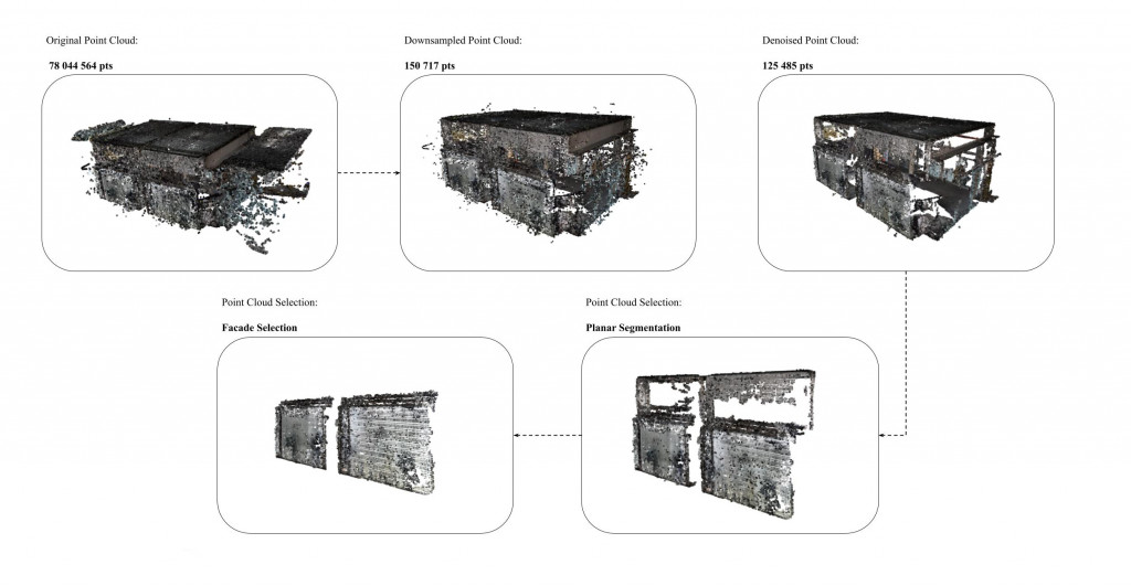 The following point cloud processing was done by applying the methodology learned throughout the MRAC 01 W2.2 Workshop with Soroush Garivani. Using the Open3D library with python, we first downsampled it by removing some pixels to make it less dense (and went from 78 044 564 points to 150 717 points). We then denoised it by removing some points that were floating around to get an overall cleaner point cloud. Lastly, we applied a planar segmentation to isolate the facade we wanted to work with. A more detailed description can be found here.