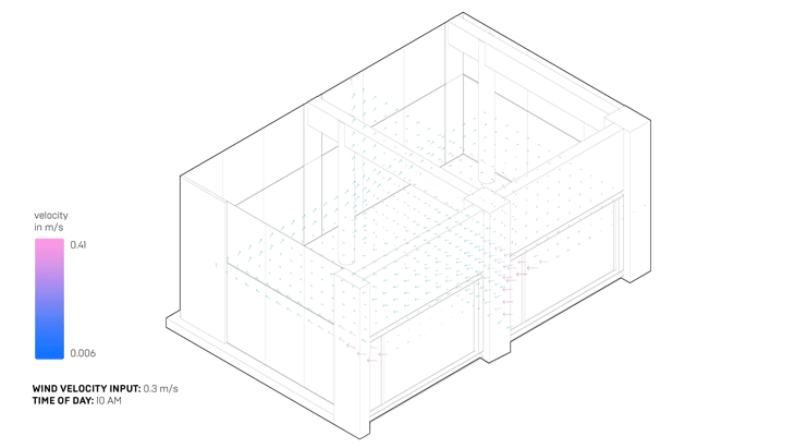 The external flow values were then used as inputs to simulate interior air flow velocities and speculate a possible directionality of indoor air flow. We used the Butterfly plugin for grasshopper to test it out.