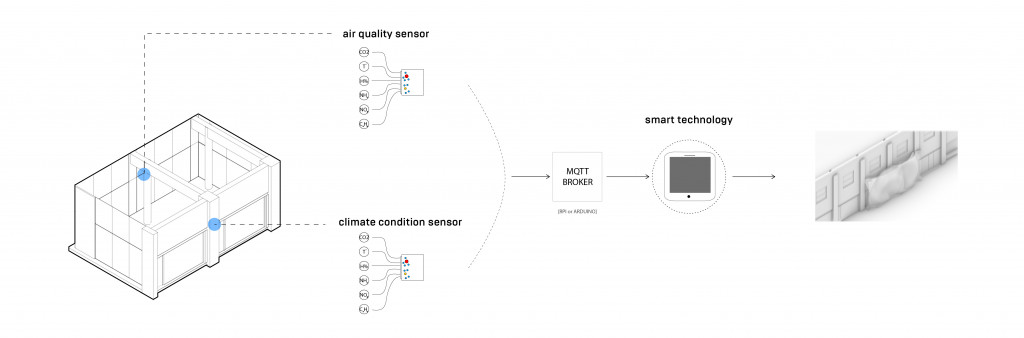 We also can use IOT technology to combine the data measurement of the air quality and the exterior climate condition. With this data and technology, we can create a network between the datalogger and the reactive skin that can give continuous feedback.