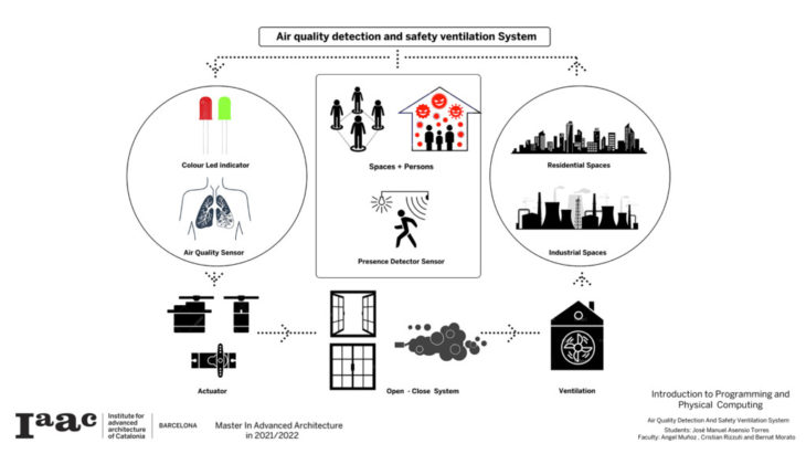 Given the proposed exercise that consists of carrying out the software code and prototype in Arduino in which two sensors of different types and an actuator intervene, the project is developed from the idea of ??generating an air quality detection system linked to another system opening for ventilation depending on it. In addition, the system is equipped with a presence detector that makes the actuator to come into operation only when necessary, thus reducing the amount of energy required to operate and preventing it from continuously evaluating. Once in operation, it will also have two light signals as indicators of the state of it.
