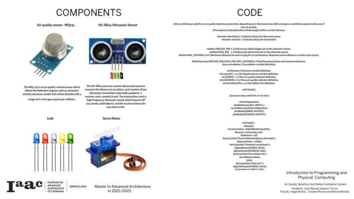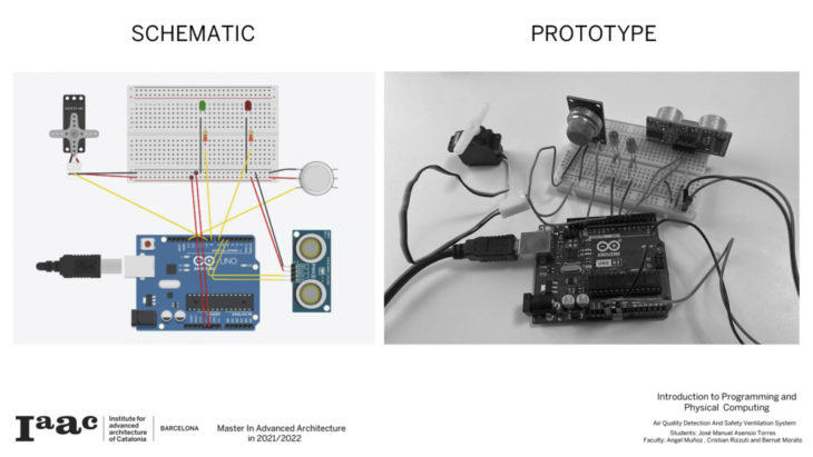 The circuit carried out works depending on the information received by the two sensors used, on tone hand the circuit comes into operation when the distance sensor detects a person at less than a certain distance, once activated the air quality sensor begins to evaluate the air quality of the room by indicating by means of two LEDs, one red and the other green if it is good or bad quality, if it is bad quality the red LED lights up as an indicator and the servomotor is activated by turning 180 degrees to open of the ventilation system, on the contrary, if it detects that the air quality is optimal, the green led is activated and the servomotor , if previously was activated, is activated again, restarting the movement but in the opposite direction to close the ventilation system.