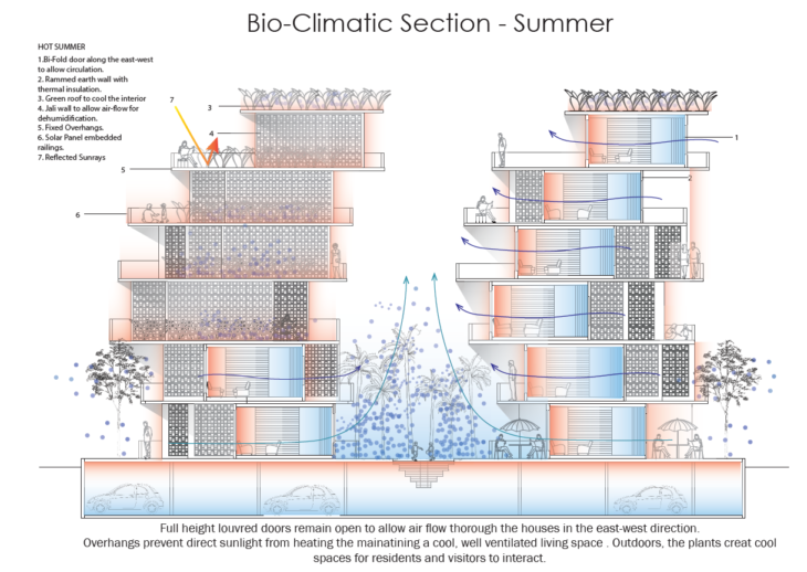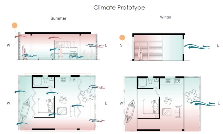 From this information, we developed a one roomed climate prototype house that would function as a solarium in the winter and allow passive ventilation during the summer. The design is a 10 x 7 m house that has 2 verandahs along the east and west that are enveloped in jaali walls to allow ventilation for our summer strategy to ensure dehumidification by having a constant airflow as the house remains completely open. For our winter strategy we have and a large south facing window to allow for solar radiation and operable glass doors in the east and west that would remain closed in the winter to ensure that the heat gained from the south façade is trapped within the house.