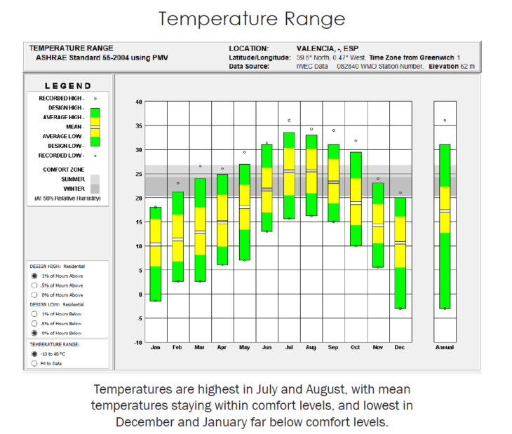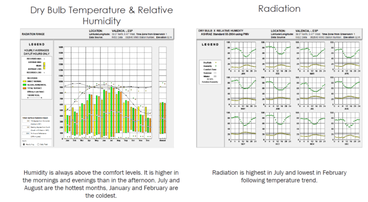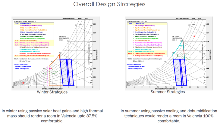 Our design process began with a thermodynamic analysis of our site. We began with the use of Climate Consultant, an analysis software, to determine the temperature ranges, humidity and radiation throughout the year to determine the best overall strategies for summer and winter.