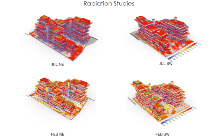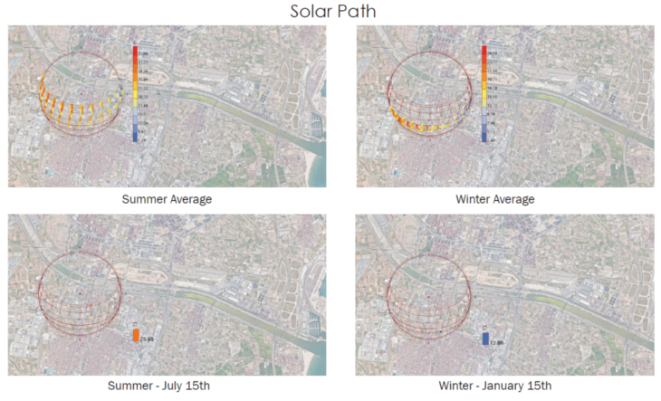 This was followed by a solar radiation analysis using Ladybug to determine the solar path to see the sun movements in summer and winter with the hottest day being 15th July and the coldest day being 15th January.
