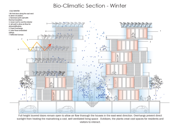 From this information, we developed a one roomed climate prototype house that would function as a solarium in the winter and allow passive ventilation during the summer. The design is a 10 x 7 m house that has 2 verandahs along the east and west that are enveloped in jaali walls to allow ventilation for our summer strategy to ensure dehumidification by having a constant airflow as the house remains completely open. For our winter strategy we have and a large south facing window to allow for solar radiation and operable glass doors in the east and west that would remain closed in the winter to ensure that the heat gained from the south façade is trapped within the house.