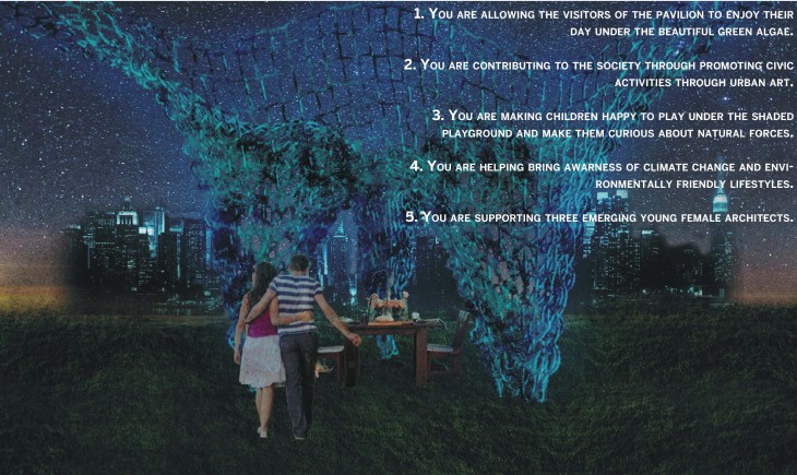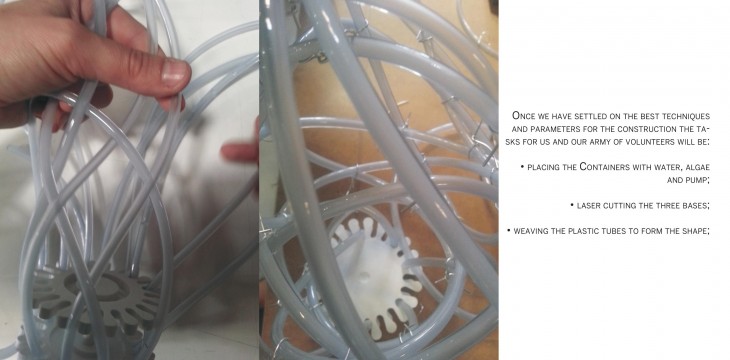 The light- weight structure is composed of an arched canopy made of tubes filled with algae supported by three anchors with water tanks underneath. The final design provides visitors with opportunities to play, rest and talk under the illuminated structure. The simplicity of the design is transformed by the combination of innovative technologies, ancient techniques and natural forces into a paradise of carefree activities. The materials we need in order to build the structure are: zinc, copper, air pump, tubes, plexi and algae. They can be found locally- at surrounding areas, making the transport costs lower.