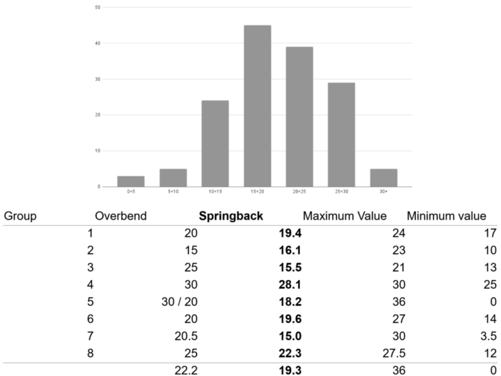 To control the springback we introduced a factor of overbending in this project. This is a variable angle which is added to the fold angle. This variable angle should be exactly the same as the springback of the fold. In this project the overbend is used the same for every fold, but every group used their own overbend angle to experiment with the parameters. We asked every group to measure every angle of resulting folds, their desired angle and their overbend. We got data from this which we used to make an overview of springback in averages and extremes.