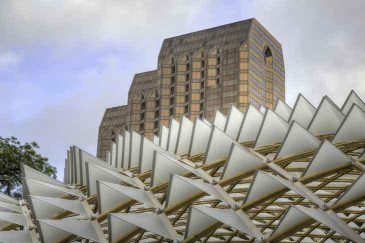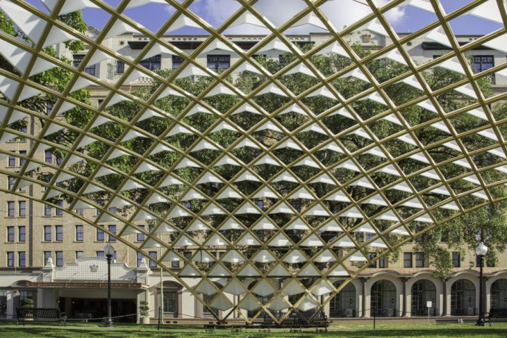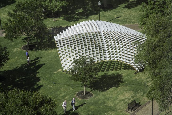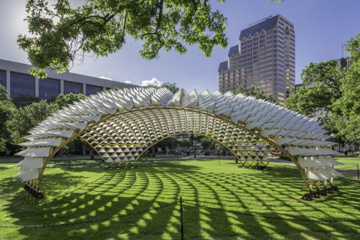 The F2 Pavilion was designed and fabricated by University of Texas San Antonio (UTSA) College of Architecture’s graduate students under the direction of Andrew Kudless, Director of Matsys and the 2014 Dean’s Distinguished Visiting Critic at UTSA, and Kevin McClellan, Co-Director at TEX-FAB and lecturer at UTSA. F² was fabricated and installed in Travis Park, a newly revitalized green space originally established as Travis Plaza in 1870. Located in the southeastern quadrant of the park adjacent to the historic St. Anthony Hotel, F² was a temporary installation in a rotating public art program in Travis Park.