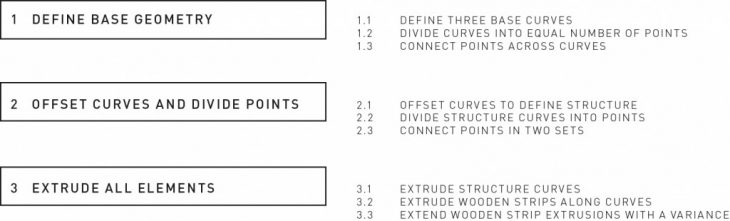 I defined the three initial curves by basing them from the high-resolution images provided on Rojkind’s website. By counting the number of structural elements in the base design, I was able to divide the curves using intersections by a polar array taken from the center of the smallest circle. Partioning the list in sets of three’s allowed me to easily select every curve and interpolate it to generate the main structural lines. The rest of the script is divided in offsetting and extruding the structural elements and dividing the curves into points for the wooden cladding.