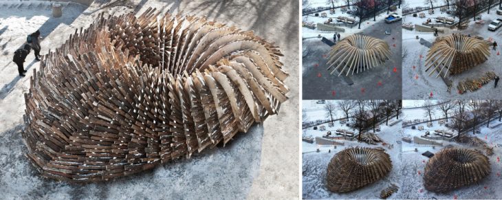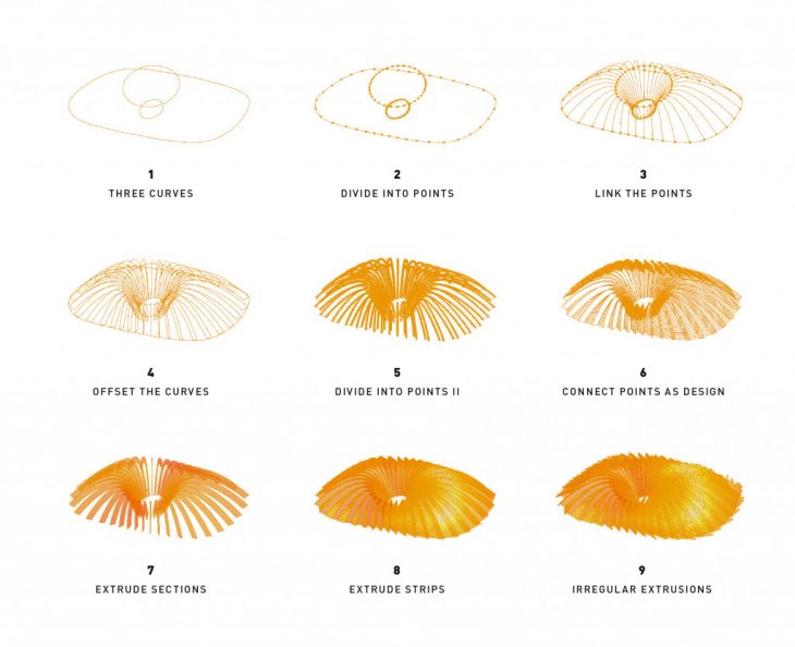 “The design seeks to create new hybrids through the implementation computer-aided design in convergence with traditional craftsmanship. the continual evolution of technology in the industry puts into question the participation of artisans in the construction process, to the extent that trades are disappearing. the pavilion examines the role of contemporary design, and questions whether or not machinery can ever learn the skills acquired by craftspeople. conversely, the scheme considers if an accomplished worker can learn new processes through modern technology, and analyzes the ever-changing role of the architect.”