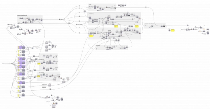 The script follows the same structure as the pseudo-code with the base geometry created on the upper left and then it is split in three branches that create respectively: the structural elements, the wood cladding panels A and the wood cladding panels B. The wood cladding was split into two parts due to the alternating nature of the wood cladding and split-list approach. The lower half of the script is the Centipede script organizing all the sequences together for the animation.