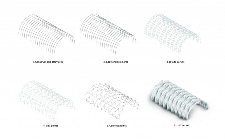 Origami spiral is a folded cloud light assembly of extruded polypropylene panels; a mass produced industrial product of eight foot by four foot sheets that is one hundred percent recyclable. The sheets are assembled in totally flat condition but it becomes a arched shape when it’s folded. No tools, machines or specialty expertise is required, simply the art of folding combined with the innovation of rethinking an everyday material. This pavilion is a luminous ice shelter from the summer sun that expands into the landscape, sheltering and framing the theatrical events that will take place within and against its faceted backdrop.