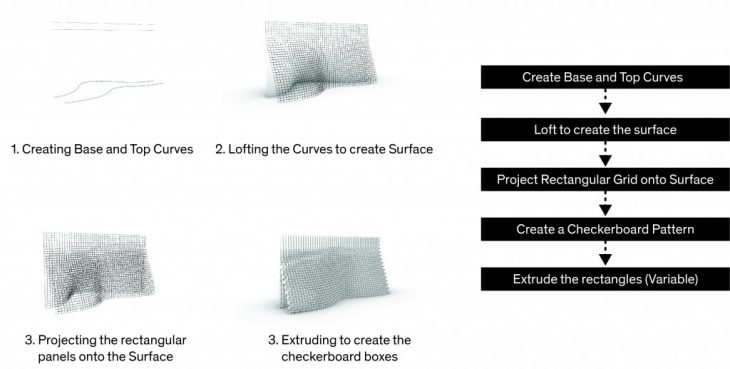The facade is composed of quad panels composed in rectangular arrays which are variably moved normal to the surface, in a checkerboard pattern