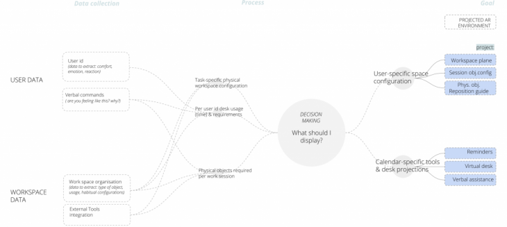 The general workflow goes from collect user and workspace data, to processing it in order to extract information such as object placement within one’s workspace, time for which each desk object has been used etc., then going through a decision making process as to what the AR assistant should display, based on a combination of machine learning and direct user input via voice control.