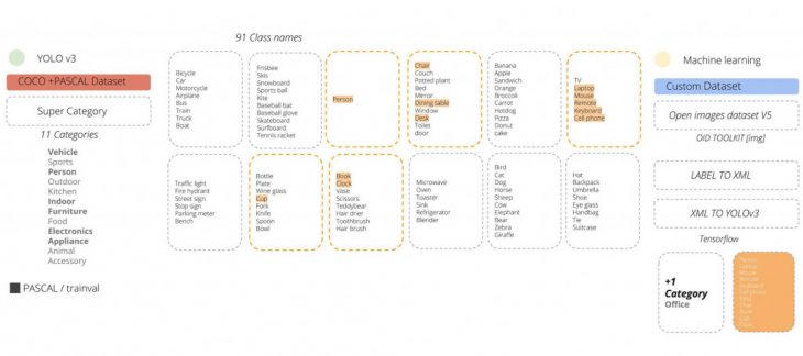 For the purpose of extracting information from the collated datasets, yolo object detection is used, trained to recognize object classes from the office realm.