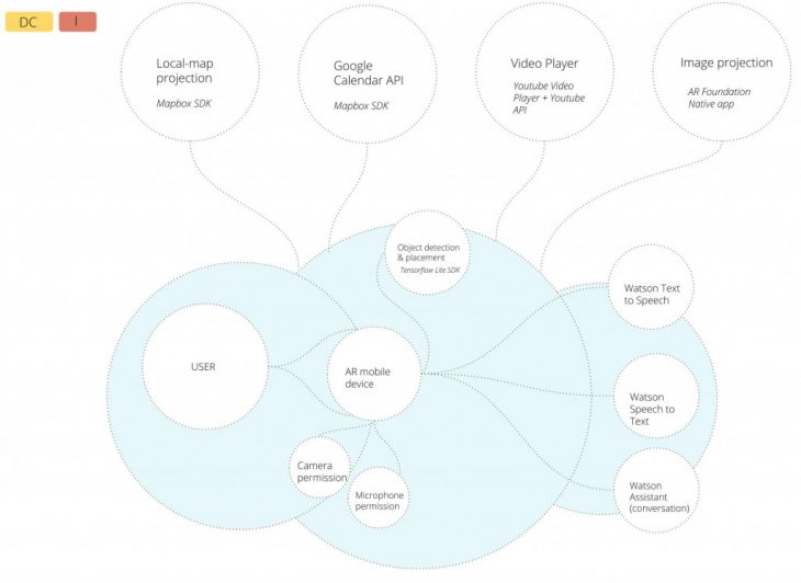 The first development strategy tackled in Unity consists of attempting to develop the voice command functionalities in order for a user to be able to communicate with the AR assistant represented by an animated character. Therefore, the workflow that follows connects the User to tbe Public cloud via the AR mobile device (with camera and microphone permissions); IBM cloud is being used to create a Watson assistant, as well as using the text to speech and speech to text IBM services.