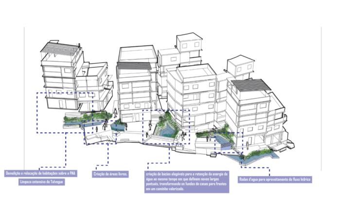 Para el desarrollo de propuestas urbanas sistémicas, se selecciona el subbarrio de Vila Verde como proyecto piloto para la aplicación de propuestas de tratamiento de aguas y disponibilidad de espacios públicos. A partir de la comprensión de la morfología existente, el proyecto busca liberar la pendiente de la conformación de las casas existentes. Un proceso de arqueología del paisaje en el que el curso del río, actualmente cubierto, y los nuevos espacios públicos tendrán un diseño que respete la estructura urbana existente potenciando las relaciones sociales. Acupuntura urbana en territorios informales basada en la interpretación morfológica, proponiendo soluciones locales para el uso del agua como recurso natural, cultural y paisajístico.