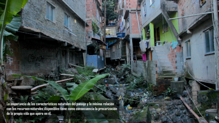 El barrio está construido entre fuertes pendientes en la esquina derecha del lado derecho de la subcuenca de São Conrado, donde la contribución del agua es muy significativa. La forma “cáscara ” de la microcuenca donde se encuentra el barrio, junto con la enorme impermeabilidad del suelo intensifican la rápida aglomeración de agua con alta presión de escorrentía en las laderas. Estos escurren en dirección a la área baja São Conrado hacia el mar. En estos talvegues todavía podemos encontrar manantiales de agua que redefinen los surcos como masas de agua. Son ríos y cascadas aún vivos, que fluyen entre o bajo edificios muy densos. La inoperancia de las características naturales del paisaje es la razón de la precariedad de la propia vida que opera en ella. Por lo tanto, no sólo será importante sanear (es decir no sólo será importante higienizar (es decir, ofrecer una donde la presencia de edificios intensifica drásticamente la la falta de asentamientos en el barrio en su conjunto, pero será fundamental hacerlo sobre la base de los características específicas del territorio, tanto naturales como culturales.
