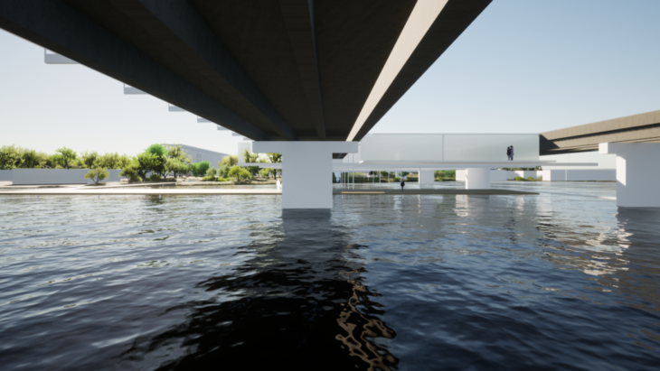 Em trecho de seu texto A Cidade Genérica (KOOLHAAS, 2014) Rem Koolhaas se refere a multiplicação de infraestruturas numa lógica competitiva. É simples, porém, transpor este discurso a uma lógica Latino Americana de escassez em que as infraestruturas permanecem as mesmas e ainda assim já não mais reproduzem um sistema de benesses, não por seu caráter funcional primordial, mas porque estão alheias as necessidades urgentes do mundo contemporâneo. De forma quase diametralmente oposta a ponte de raízes de Mawlynnong, na Índia (WATSON, 2019), a infraestrutura de mobilidade urbana de Porto Alegre, principalmente sobre o rio Guaíba, não corresponde a uma necessidade humana direta e é subalterna a lógica da cidade centrada no automóvel individual e do extrativismo enquanto projeto de governo. Tenciona-se no projeto o ato de fagocitar estas infraestruturas para dissuadi-las de seu caráter puramente sintético. É no intervalo entre as infraestruturas e a natureza que se da o espaço público.