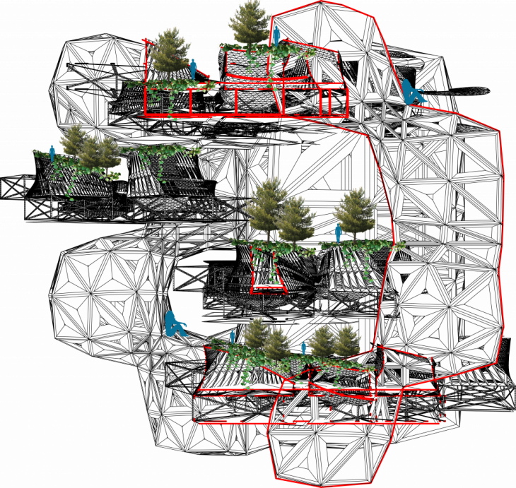 The mass distribution of building is predefined with parametric modules. These modules are connected by cross-shaped circulation areas that are used as waste collection system. Each module has a green roof, so the roofs should have the maximum amount of sunlight and radiation.