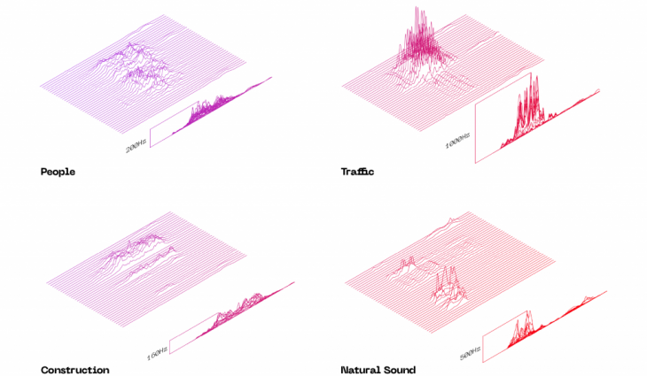 Sound can be understood as frequency, which is the measurement of how many times a second the particle will vibrate. A change in frequency means a pitch change. Thus every sound-maker who has a distinct call or noise will have a distinct frequency. In the diagram above we identified the sound frequency of prevalent sources in an urban environment.