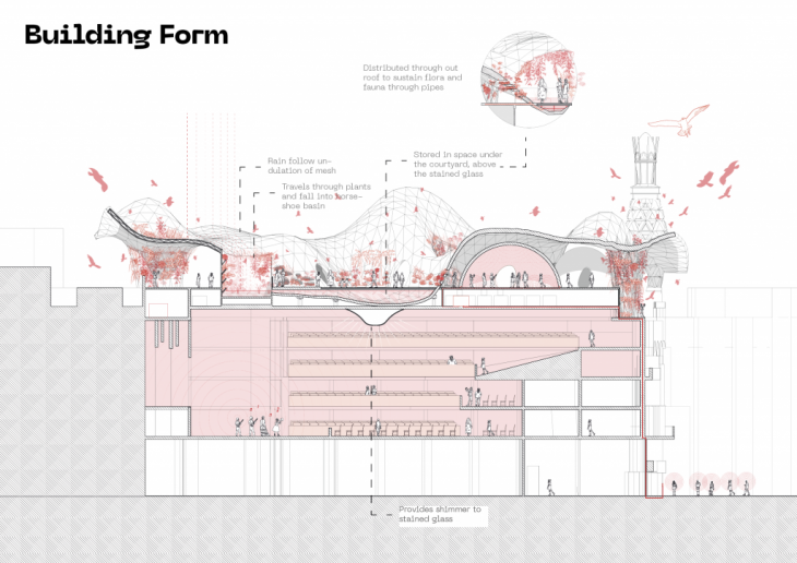This project aims to transform the Palau de la Musica, located in central Barcelona, into a noise collecting and emitting device that creates healthy internal acoustical environments and projects healthy sound into the neighborhood to attract displaced fauna and returns this urban environment to a therapeutic natural state.