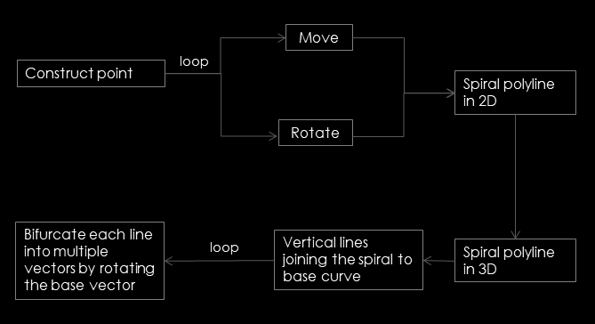 The sculpture can grow infinitely in a spiral manner and each one bifurcates into multiple vectors.