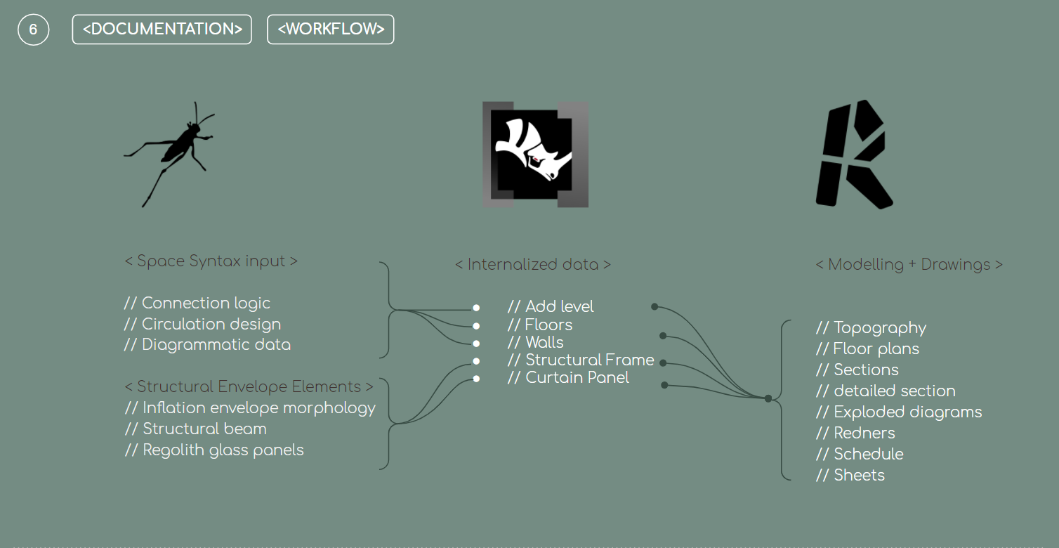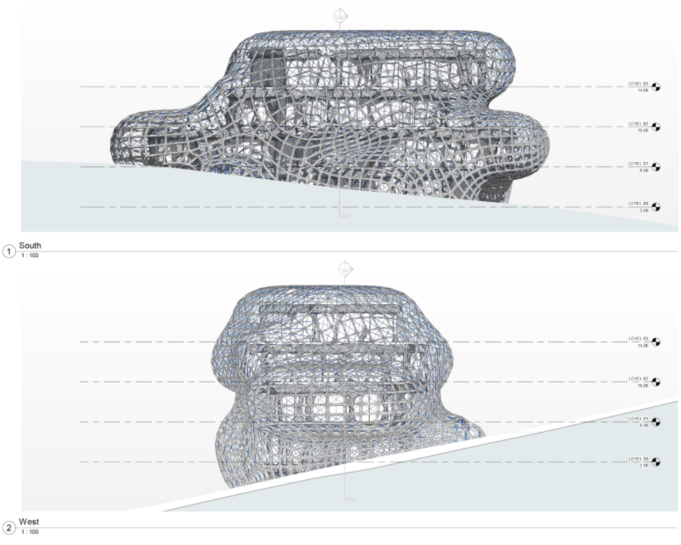 Once all the geometry was generated in Rhino and Grasshopper, we were then able to send the data to Revit through Rhino.Inside. Revit allowed for a more detailed documentation of our project