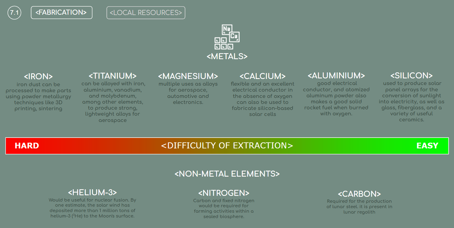 When it came to fabrication, we’ve done research that suggested that majority of all the necessary materials for construction could be extracted from the lunar regolith and converted through sintering or liquefaction into appropriate form to be used in casting and 3D printing.