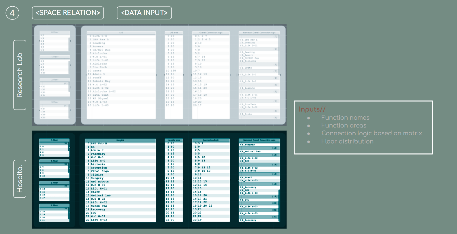 Once we had all the data matrices and understanding of the connection logic, we used space syntax plugin called Syntatic to generate organic floor plans.