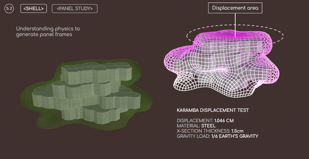 After the massing and structure (topos) were done, we then used Kangaroo to inflate the mesh and create and outer shell. The shell would provide both protective properties (from solar radiation), but also allow to create exciting spaces between the shell and the inner building.